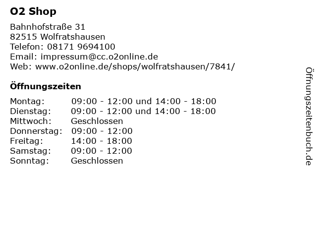| Öffnungszeiten O2 Shop in Wolfratshausen anzeigen | |