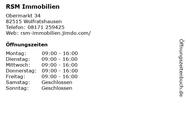 | Öffnungszeiten RSM Immobilien in Wolfratshausen anzeigen | |