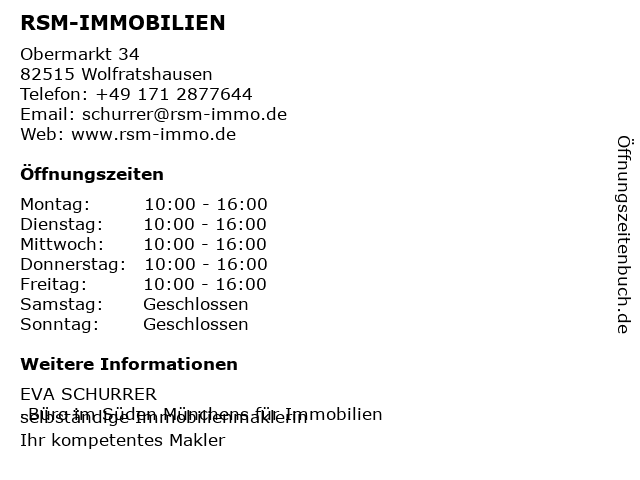 | Öffnungszeiten RSM-IMMOBILIEN in Wolfratshausen anzeigen | |