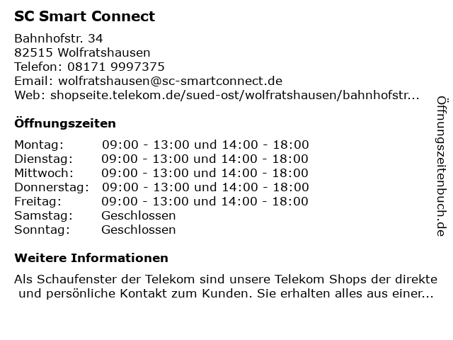 | Öffnungszeiten SC Smart Connect in Wolfratshausen anzeigen | |