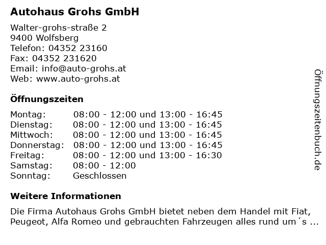 | Öffnungszeiten Autohaus Grohs GmbH in Wolfsberg anzeigen | |
