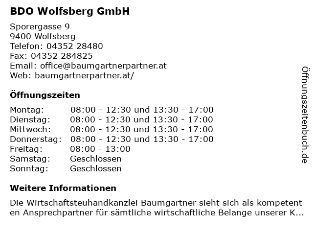 | Öffnungszeiten BDO Wolfsberg GmbH in Wolfsberg anzeigen | |