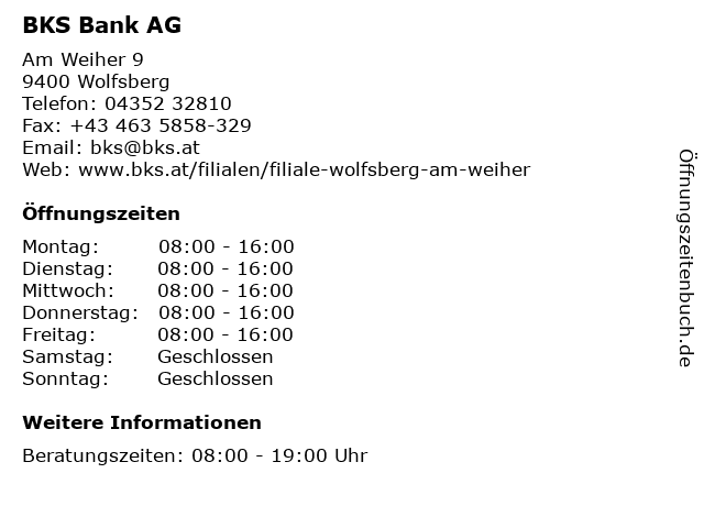 | Öffnungszeiten BKS Bank AG in Wolfsberg anzeigen | |