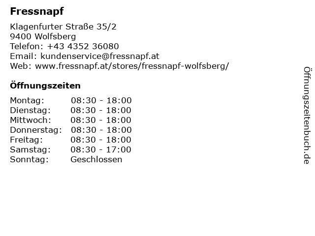 | Öffnungszeiten Fressnapf in Wolfsberg anzeigen | |