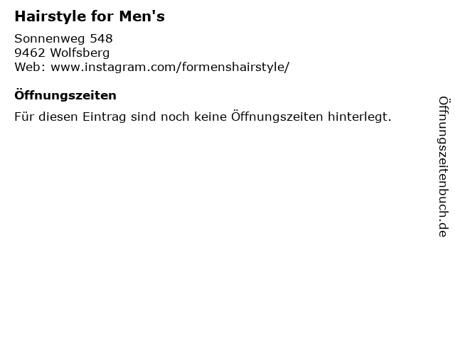 | Öffnungszeiten Hairstyle for Men's in Wolfsberg anzeigen | |