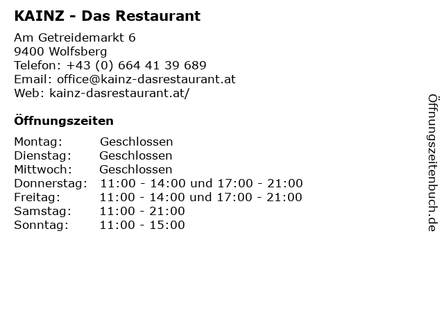 | Öffnungszeiten KAINZ - Das Restaurant in Wolfsberg anzeigen | |