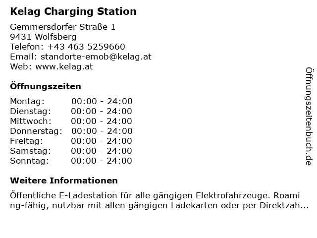 | Öffnungszeiten Kelag Charging Station in Wolfsberg anzeigen | |