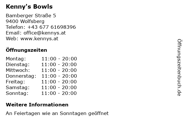 | Öffnungszeiten Kenny's Bowls in Wolfsberg anzeigen | |