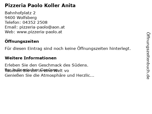 | Öffnungszeiten Pizzeria Paolo Koller Anita in Wolfsberg anzeigen | |