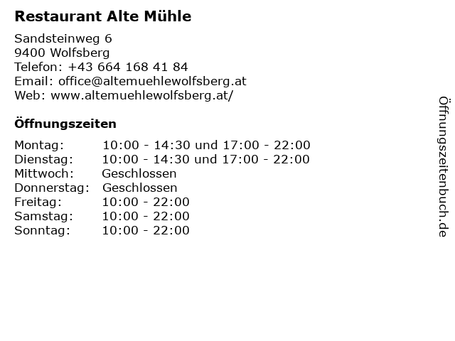 | Öffnungszeiten Restaurant Alte Mühle in Wolfsberg anzeigen | |