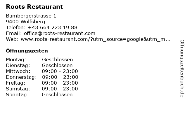 | Öffnungszeiten Roots Restaurant in Wolfsberg anzeigen | |