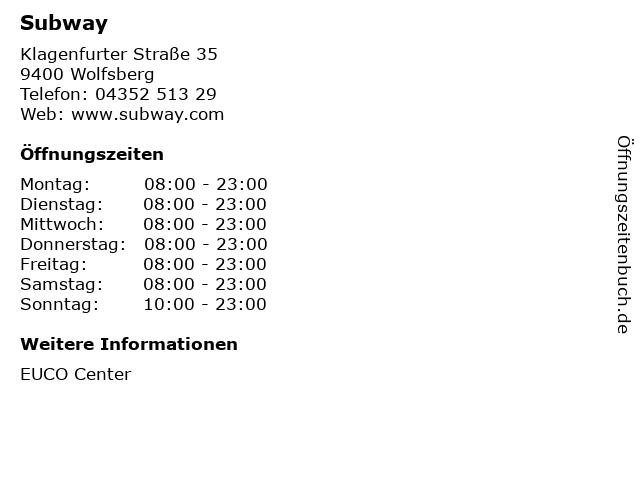 | Öffnungszeiten Subway in Wolfsberg anzeigen | |