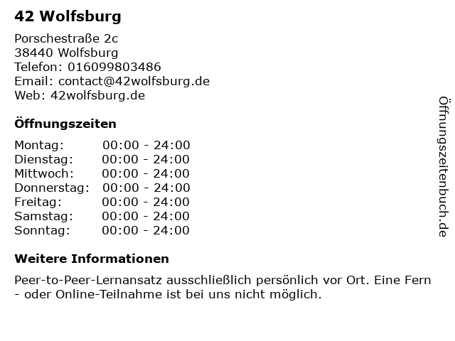 | Öffnungszeiten 42 Wolfsburg in Wolfsburg anzeigen | |