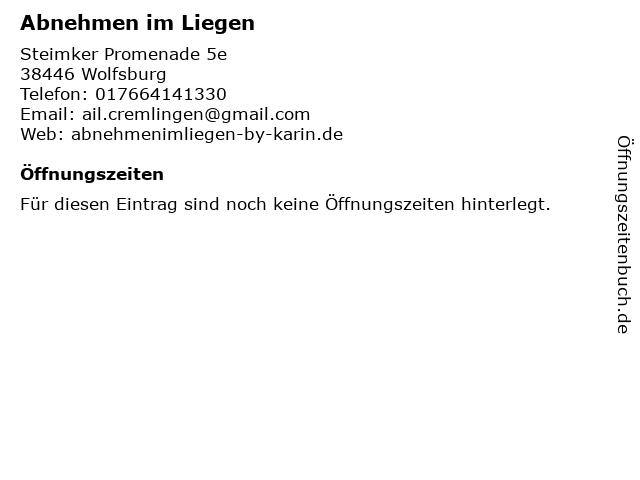 | Öffnungszeiten Abnehmen im Liegen in Wolfsburg anzeigen | |