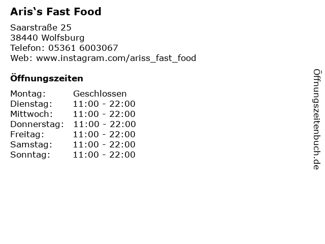 | Öffnungszeiten Aris‘s Fast Food in Wolfsburg anzeigen | |