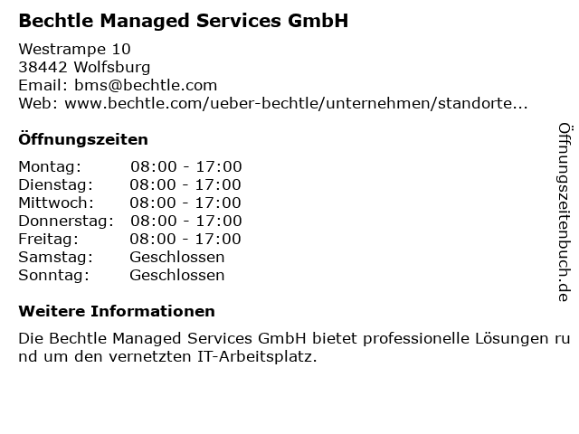 | Öffnungszeiten Bechtle Managed Services GmbH in Wolfsburg anzeigen | |