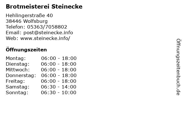 | Öffnungszeiten Brotmeisterei Steinecke in Wolfsburg anzeigen | |