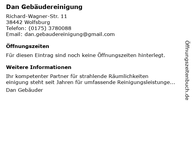 | Öffnungszeiten Dan Gebäudereinigung in Wolfsburg anzeigen | |