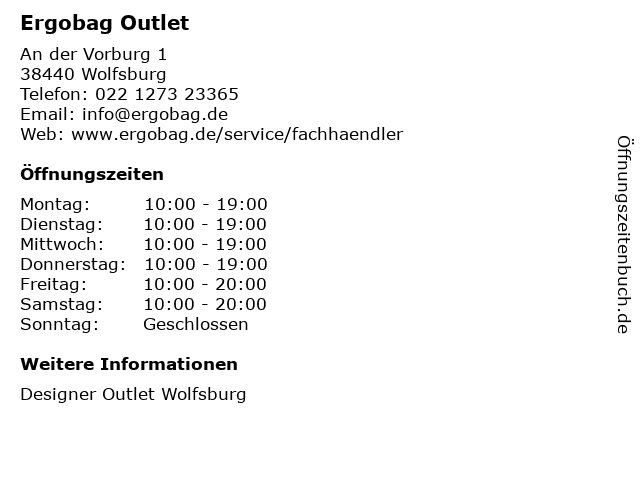| Öffnungszeiten Ergobag Outlet in Wolfsburg anzeigen | |