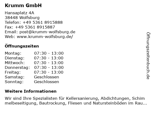 | Öffnungszeiten Krumm GmbH in Wolfsburg anzeigen | |