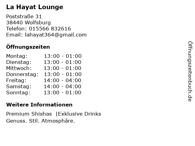 | Öffnungszeiten La Hayat Lounge in Wolfsburg anzeigen | |