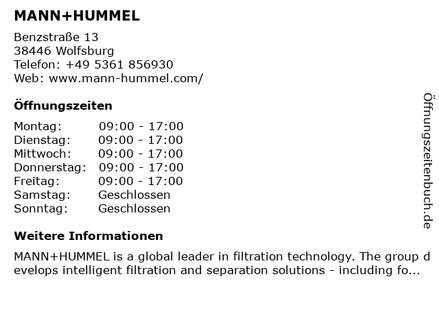 | Öffnungszeiten MANN+HUMMEL in Wolfsburg anzeigen | |