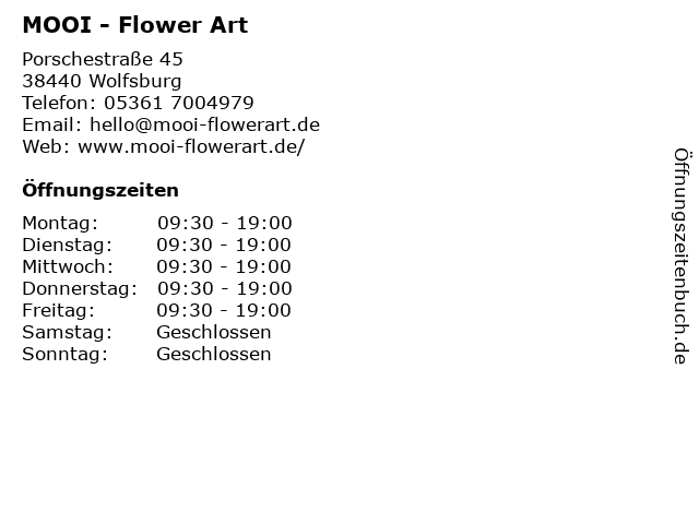 | Öffnungszeiten MOOI - Flower Art in Wolfsburg anzeigen | |