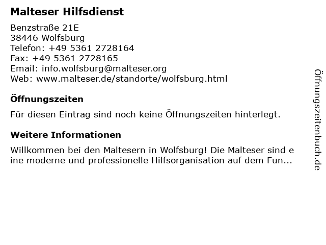 | Öffnungszeiten Malteser Hilfsdienst in Wolfsburg anzeigen | |