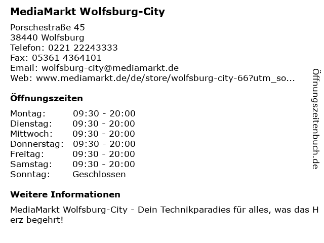 | Öffnungszeiten MediaMarkt Wolfsburg-City in Wolfsburg anzeigen | |