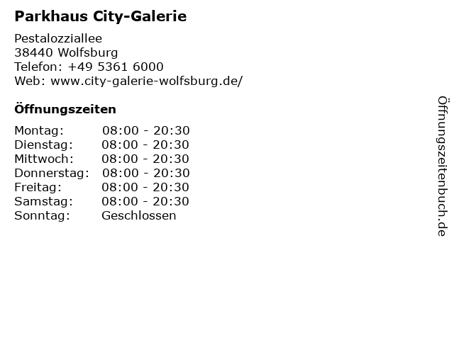 | Öffnungszeiten Parkhaus City-Galerie in Wolfsburg anzeigen | |