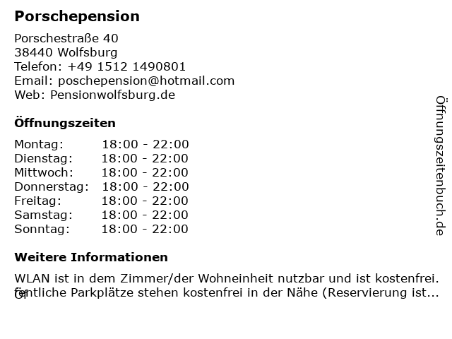 | Öffnungszeiten Porschepension in Wolfsburg anzeigen | |