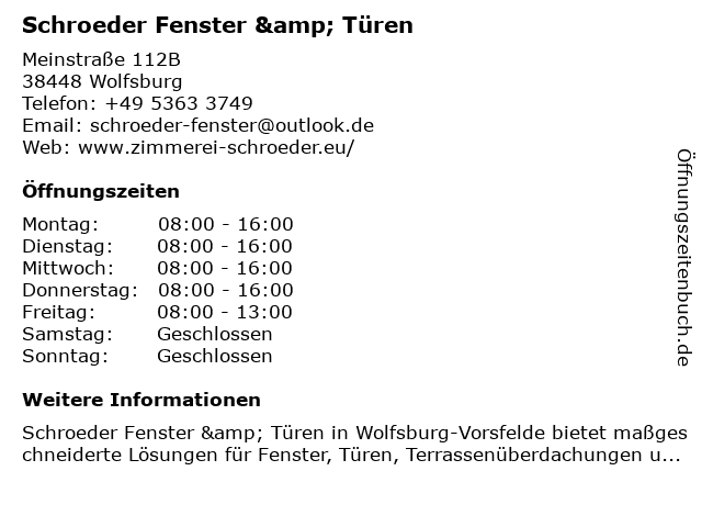 | Öffnungszeiten Schroeder Fenster & Türen in Wolfsburg anzeigen | |