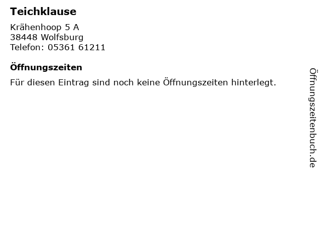 | Öffnungszeiten Teichklause in Wolfsburg anzeigen | |