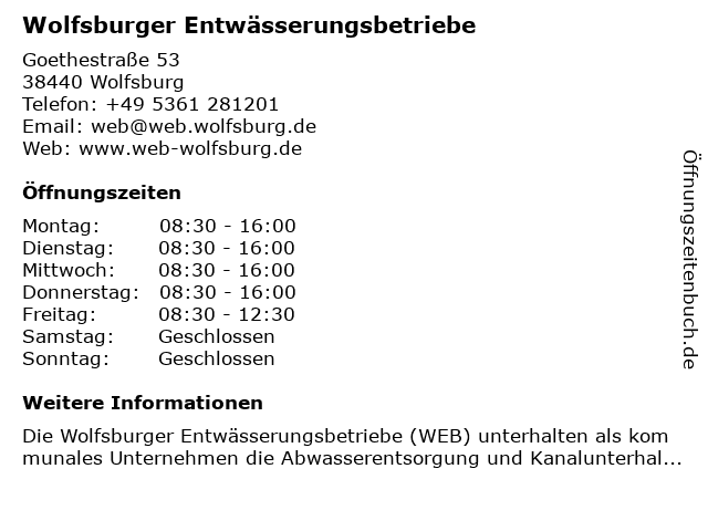 Branchen & Suchbegriffe zu Wolfsburger Entwässerungsbetriebe:abwasser, abwasseranlagen, dichtheitsprüfung, entwässerungsbetriebe, gartenwasserzähler, grundstückentwässerung, kanalisation, kläranlage, regenrückhalteanlagen, regenwasser, schmutzwasser, wolfsburger |
