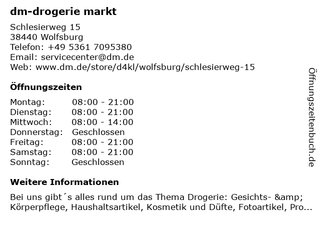 | Öffnungszeiten dm-drogerie markt in Wolfsburg anzeigen | |