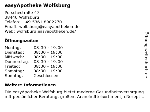 | Öffnungszeiten easyApotheke Wolfsburg in Wolfsburg anzeigen | |