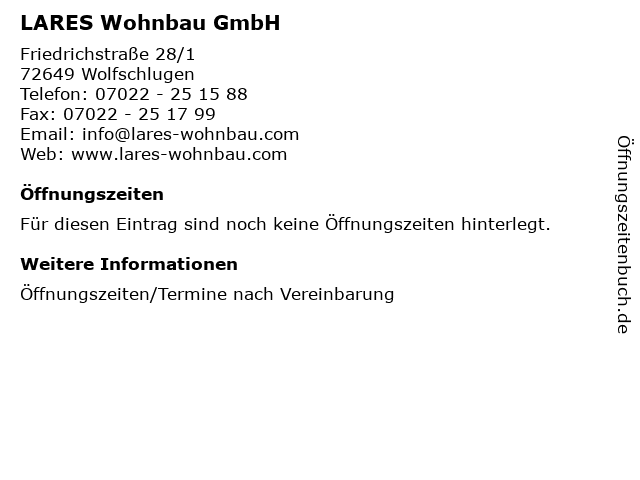 | Öffnungszeiten LARES Wohnbau GmbH in Wolfschlugen anzeigen | |