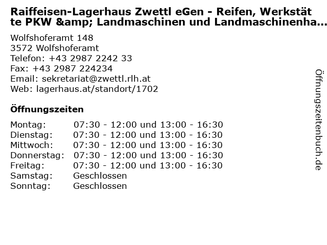 1 Raiffeisen-Lagerhaus Zwettl eGen - Bau & Garten (Entfernung: 0,00 km) Wolfshoferamt 148, 3572 Wolfshoferamt 2 Raiffeisen-Lagerhaus Zwettl eGen - Agrar, Baustoffe und Brennstoffe (Entfernung: 0,00 km) Wolfshoferamt 148, 3572 Wolfshoferamt 3 Raiffeisen-Lagerhaus Zwettl eGen - Ersatzteile (Entfernung: 0,02 km) Wolfshoferamt 148, 3572 Wolfshoferamt 5 6 |