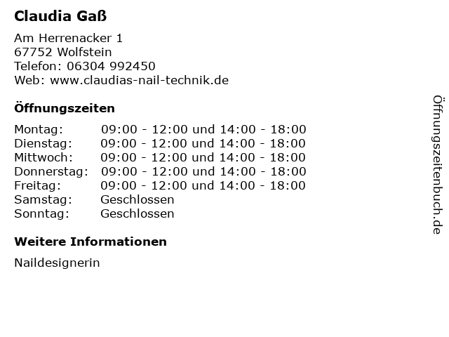 | Öffnungszeiten Claudia Gaß in Wolfstein anzeigen | |