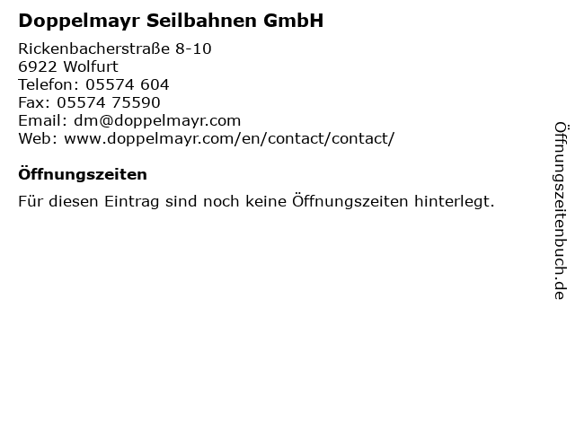 | Öffnungszeiten Doppelmayr Seilbahnen GmbH in Wolfurt anzeigen | |
