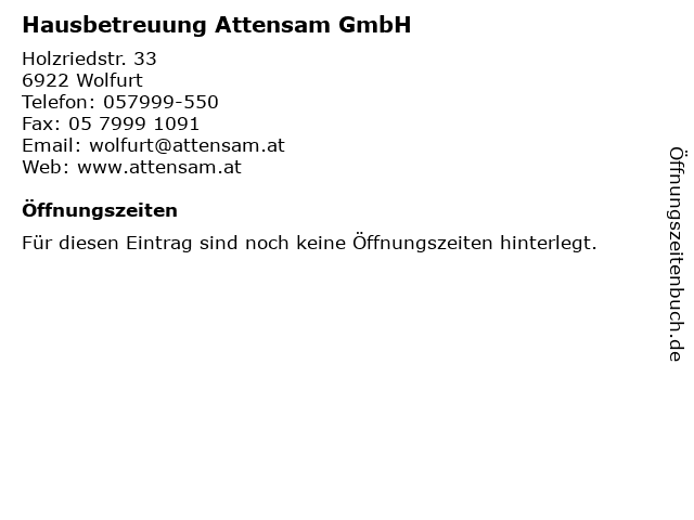 | Öffnungszeiten Hausbetreuung Attensam GmbH in Wolfurt anzeigen | |