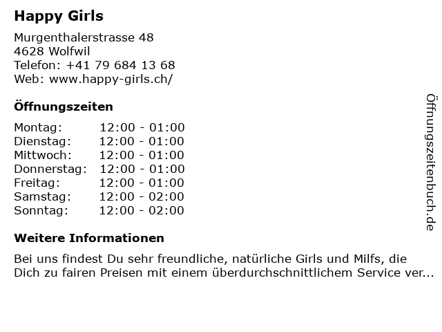 | Öffnungszeiten Happy Girls in Wolfwil anzeigen | |