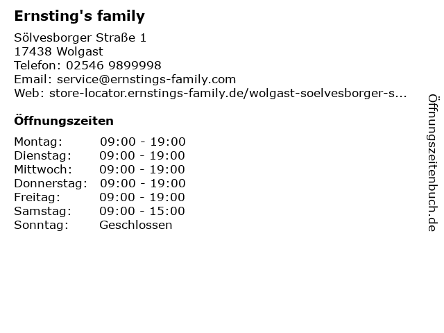 | Öffnungszeiten Ernsting's family in Wolgast anzeigen | |