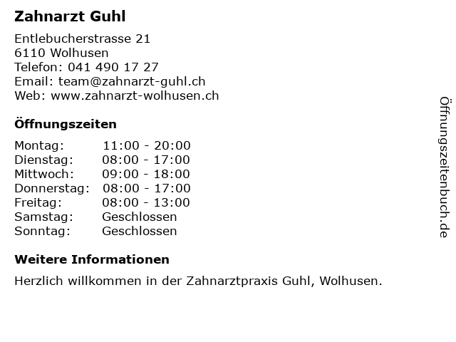| Öffnungszeiten Zahnarzt Guhl in Wolhusen anzeigen | |