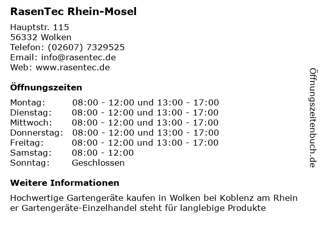 | Öffnungszeiten RasenTec Rhein-Mosel in Wolken anzeigen | |