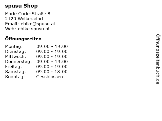 | Öffnungszeiten spusu Shop in Wolkersdorf anzeigen | |