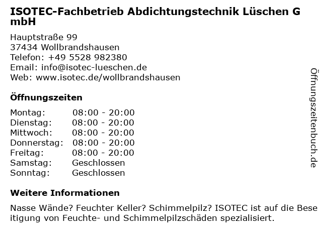 1 ISOTEC-Fachbetrieb Abdichtungstechnik Saterdag (Entfernung: 16,12 km) Guldenhagen 43, 37085 Göttingen 5 ENTTEK - Entfeuchtungstechnik, Inh. Heiko Irmscher (Entfernung: 26,47 km) Ringstraße 5, 37441 Bad Sachsa 6 |