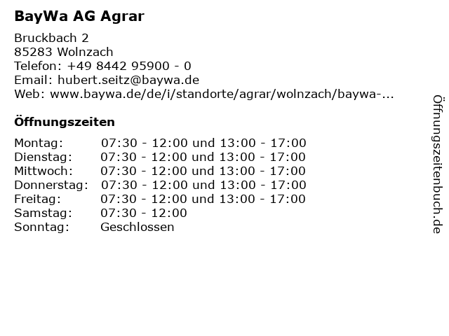 | Öffnungszeiten BayWa AG Agrar in Wolnzach anzeigen | |