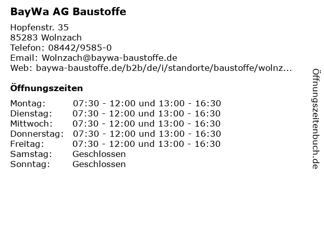 | Öffnungszeiten BayWa AG Baustoffe in Wolnzach anzeigen | |