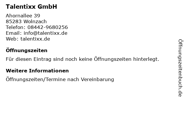 | Öffnungszeiten Talentixx GmbH in Wolnzach anzeigen | |